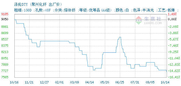10月14日聚兴化纤关于涤纶DTY的报价为7700元/吨。涤纶DTY的规格:粗细:150D ;孔数:48F ;分类:熔体纺 ;等级:优等品(AA级) ;颜色:白 ;色泽:半消光 ;工艺:低弹 ;。该报价有效期为7天。报价提供方:浙江聚兴化纤有限公司。