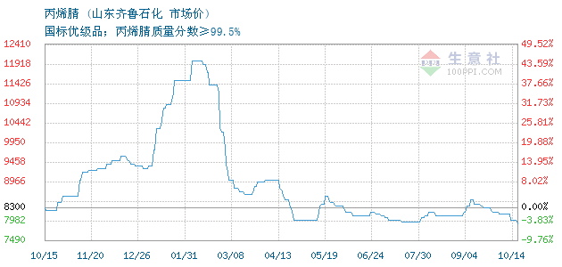 10月14日山东齐鲁石化关于丙烯腈的报价为7900元/吨。丙烯腈的规格:国标优级品;丙烯腈质量分数≥99.5%。该报价有效期为3天。报价提供方:山东北方蓝天石化有限公司。