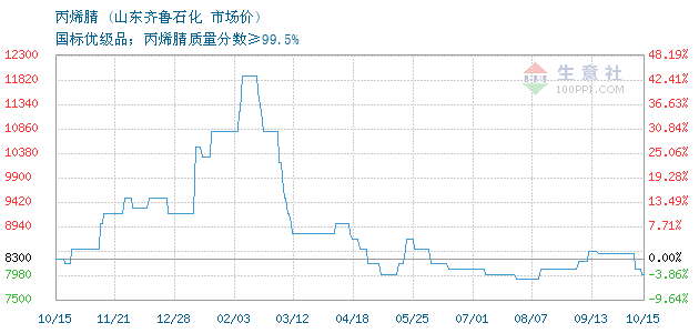 10月15日山东齐鲁石化关于丙烯腈的报价为8000元/吨。丙烯腈的规格:国标优级品;丙烯腈质量分数≥99.5%。该报价有效期为3天。报价提供方:上海溶和化工有限公司。