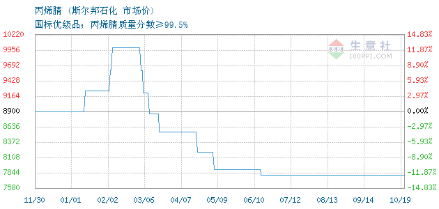 10月17日斯尔邦石化关于丙烯腈的报价为7800元/吨。丙烯腈的规格:国标优级品;丙烯腈质量分数≥99.5%。该报价有效期为3天。报价提供方:青岛盛泽化工有限公司。