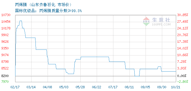 10月17日山东齐鲁石化关于丙烯腈的报价为8400元/吨。丙烯腈的规格:国标优级品;丙烯腈质量分数≥99.5%。该报价有效期为3天。报价提供方:济南昂新化工有限公司。