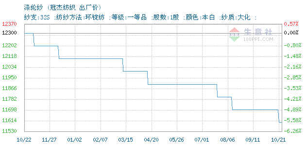 10月17日潍坊冠杰纺织有限公司关于32S涤纶纱的报价为11600元/吨。32S涤纶纱的规格:纱支:32S ;纺纱方法:环锭纺 ;等级:一等品 ;股数:1股 ;颜色:本白 ;纱质:大化 ;。该报价有效期为3天。报价提供方:山东潍坊冠杰纺织有限公司。