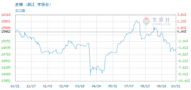 10月17日浙江地区关于皮棉的报价为14850元/吨。皮棉的规格:3128B。该报价有效期为1天。报价提供方:浙江市场。