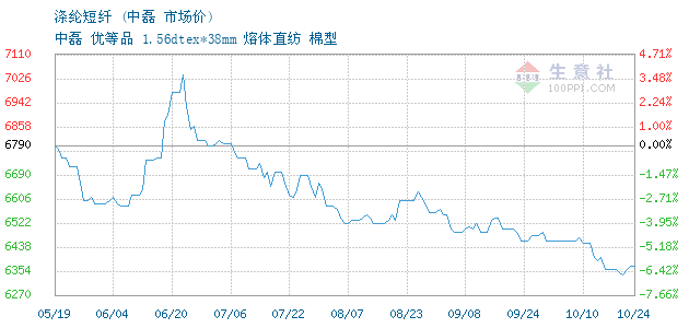 10月24日中磊关于涤纶短纤的报价为6370元/吨。涤纶短纤的规格:中磊 优等品 1.56dtex*38mm 熔体直纺 棉型 。该报价有效期为1天。报价提供方:厦门象屿化工有限公司。