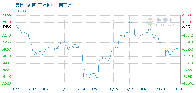 10月31日河南地区关于皮棉的报价为14896元/吨。皮棉的规格:3128B。该报价有效期为1天。报价提供方:河南市场。