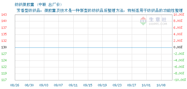 10月05日中联关于纺织微胶囊的报价为130元/公斤。纺织微胶囊的规格: 芳香型纺织品:微胶囊及技术是一种新型的纺织品后整理方法,特别适用于纺织品的功能性整理。该报价有效期为3天。报价提供方:聊城市鑫盛达新能源科技有限公司。