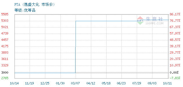 10月06日逸盛大化关于PTA的报价为5350元/吨。PTA的规格:等级:优等品。该报价有效期为1天。报价提供方:武汉市恒久化工有限公司。