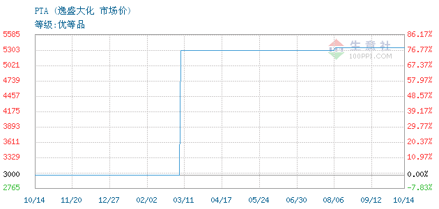10月08日逸盛大化关于PTA的报价为5350元/吨。PTA的规格:等级:优等品。该报价有效期为1天。报价提供方:武汉市恒久化工有限公司。