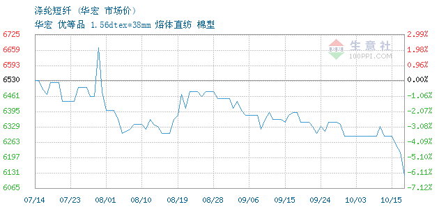 10月09日华宏关于涤纶短纤的报价为6290元/吨。涤纶短纤的规格:华宏 优等品 1.56dtex*38mm 熔体直纺 棉型 。该报价有效期为1天。报价提供方:保定纳威新材料科技有限公司。