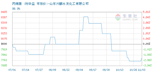 11月01日利华益关于丙烯腈的报价为7750元/吨。丙烯腈的规格:99.9%。该报价有效期为3天。报价提供方:山东兴鹏永发化工有限公司。