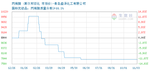 11月01日斯尔邦石化关于丙烯腈的报价为7800元/吨。丙烯腈的规格:国标优级品;丙烯腈质量分数≥99.5%。该报价有效期为3天。报价提供方:青岛盛泽化工有限公司。