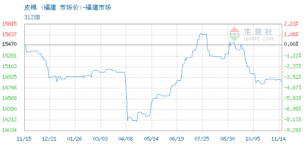 11月11日福建地区关于皮棉的报价为14890元/吨。皮棉的规格:3128B。该报价有效期为1天。报价提供方:福建市场。