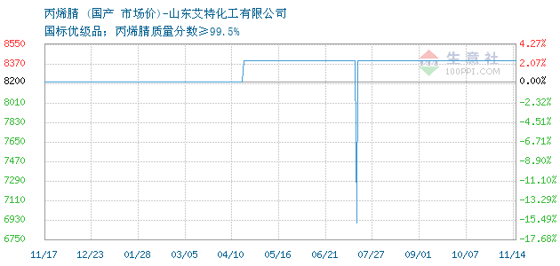 11月12日国产关于丙烯腈的报价为8400元/吨。丙烯腈的规格:国标优级品;丙烯腈质量分数≥99.5%。该报价有效期为7天。报价提供方:山东艾特化工有限公司。