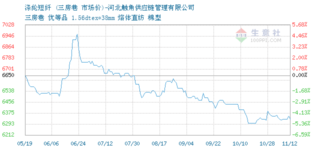 11月12日三房巷关于涤纶短纤的报价为6330元/吨。涤纶短纤的规格:三房巷 优等品 1.56dtex*38mm 熔体直纺 棉型 。该报价有效期为1天。报价提供方:河北触角供应链管理有限公司。