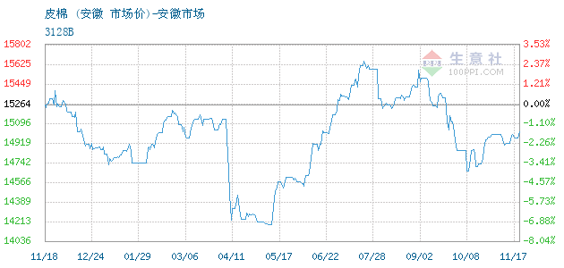 11月12日安徽地区关于皮棉的报价为14995元/吨。皮棉的规格:3128B。该报价有效期为1天。报价提供方:安徽市场。