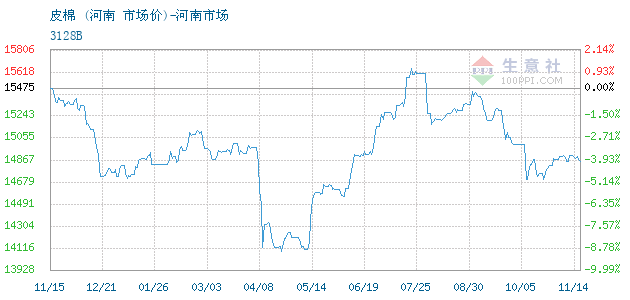 11月13日河南地区关于皮棉的报价为14873元/吨。皮棉的规格:3128B。该报价有效期为1天。报价提供方:河南市场。