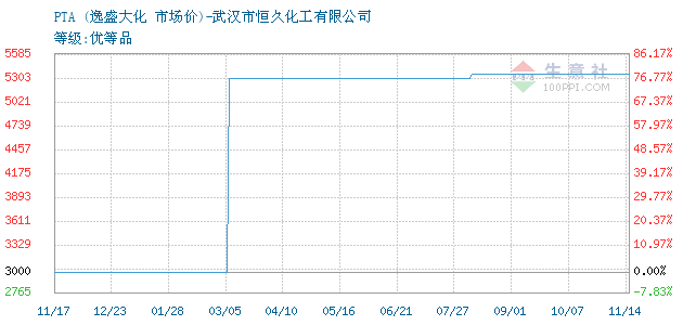 11月14日逸盛大化关于PTA的报价为5350元/吨。PTA的规格:等级:优等品。该报价有效期为1天。报价提供方:武汉市恒久化工有限公司。