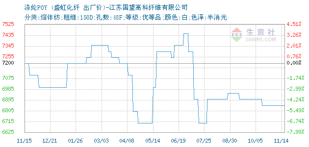 11月14日盛虹化纤关于涤纶POY的报价为6850元/吨。涤纶POY的规格:分类:熔体纺;粗细:150D;孔数:48F;等级:优等品;颜色:白;色泽:半消光。该报价有效期为3天。报价提供方:江苏国望高科纤维有限公司。
