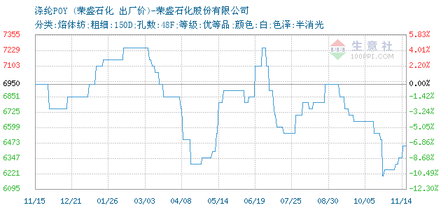 11月14日荣盛石化关于涤纶POY的报价为6450元/吨。涤纶POY的规格:分类:熔体纺;粗细:150D;孔数:48F;等级:优等品;颜色:白;色泽:半消光。该报价有效期为7天。报价提供方:荣盛石化股份有限公司。