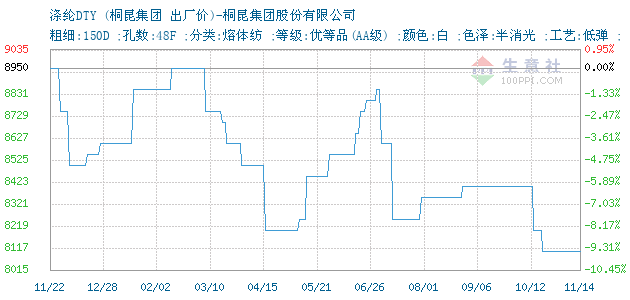 11月14日桐昆集团关于涤纶DTY的报价为8100元/吨。涤纶DTY的规格:粗细:150D ;孔数:48F ;分类:熔体纺 ;等级:优等品(AA级) ;颜色:白 ;色泽:半消光 ;工艺:低弹 ;。该报价有效期为3天。报价提供方:桐昆集团股份有限公司。