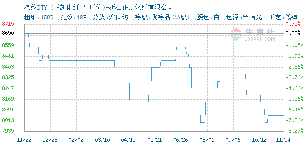 11月14日浙江正凯化纤有限公司关于涤纶DTY的报价为8050元/吨。涤纶DTY的规格:粗细:150D ;孔数:48F ;分类:熔体纺 ;等级:优等品(AA级) ;颜色:白 ;色泽:半消光 ;工艺:低弹 ;。该报价有效期为7天。报价提供方:浙江正凯化纤有限公司。