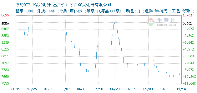 11月14日聚兴化纤关于涤纶DTY的报价为7750元/吨。涤纶DTY的规格:粗细:150D ;孔数:48F ;分类:熔体纺 ;等级:优等品(AA级) ;颜色:白 ;色泽:半消光 ;工艺:低弹 ;。该报价有效期为7天。报价提供方:浙江聚兴化纤有限公司。