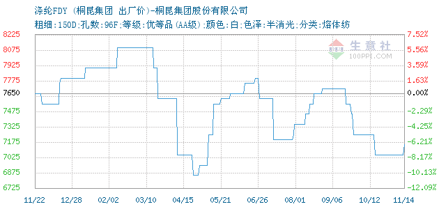 11月14日桐昆集团关于涤纶FDY的报价为7150元/吨。涤纶FDY的规格:粗细:150D;孔数:96F;等级:优等品(AA级);颜色:白;色泽:半消光;分类:熔体纺。该报价有效期为7天。报价提供方:桐昆集团股份有限公司。