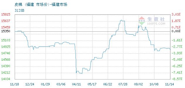 11月14日福建地区关于皮棉的报价为14860元/吨。皮棉的规格:3128B。该报价有效期为1天。报价提供方:福建市场。