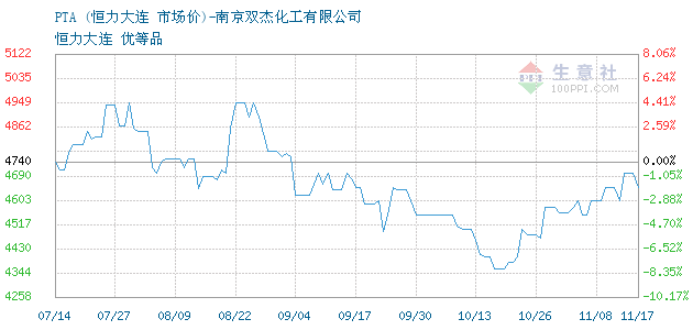 11月14日恒力大连关于PTA的报价为4700元/吨。PTA的规格:恒力大连 优等品 。该报价有效期为1天。报价提供方:南京双杰化工有限公司。