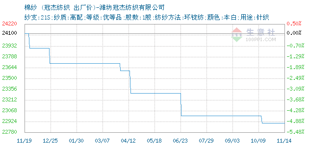 11月14日潍坊冠杰纺织有限公司关于棉纱21S的报价为22900元/吨。棉纱21S的规格:纱支:21S;纱质:高配;等级:优等品;股数:1股;纺纱方法:环锭纺;颜色:本白;用途:针织。该报价有效期为3天。报价提供方:潍坊冠杰纺织有限公司。