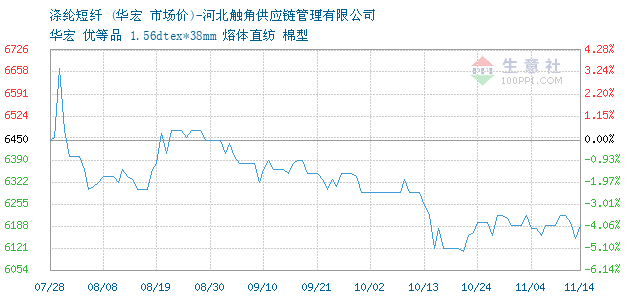 11月14日华宏关于涤纶短纤的报价为6190元/吨。涤纶短纤的规格:华宏 优等品 1.56dtex*38mm 熔体直纺 棉型 。该报价有效期为1天。报价提供方:河北触角供应链管理有限公司。