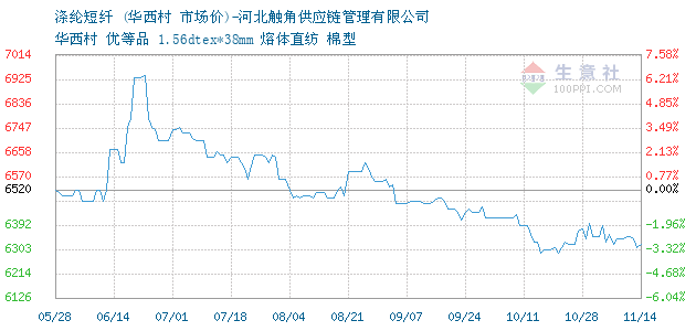11月14日华西村关于涤纶短纤的报价为6320元/吨。涤纶短纤的规格:华西村 优等品 1.56dtex*38mm 熔体直纺 棉型 。该报价有效期为1天。报价提供方:河北触角供应链管理有限公司。