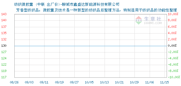 11月15日中联关于纺织微胶囊的报价为130元/公斤。纺织微胶囊的规格: 芳香型纺织品:微胶囊及技术是一种新型的纺织品后整理方法,特别适用于纺织品的功能性整理。该报价有效期为3天。报价提供方:聊城市鑫盛达新能源科技有限公司。