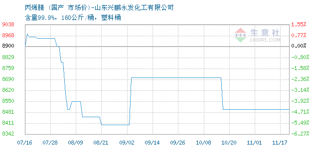 11月16日国产关于丙烯腈的报价为8500元/吨。丙烯腈的规格:含量99.9%,160公斤/桶,塑料桶。该报价有效期为3天。报价提供方:山东兴鹏永发化工有限公司。