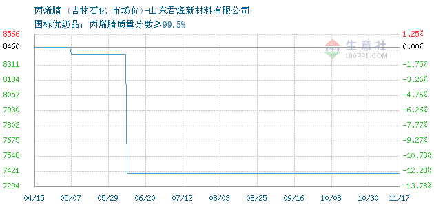 11月17日吉林石化关于丙烯腈的报价为7400元/吨。丙烯腈的规格:国标优级品;丙烯腈质量分数≥99.5%。该报价有效期为3天。报价提供方:山东君烽新材料有限公司。