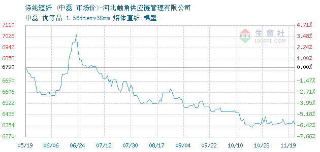 11月17日中磊关于涤纶短纤的报价为6360元/吨。涤纶短纤的规格:中磊 优等品 1.56dtex*38mm 熔体直纺 棉型 。该报价有效期为1天。报价提供方:河北触角供应链管理有限公司。