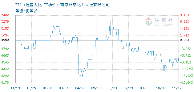 11月17日逸盛大化关于PTA的报价为4650元/吨。PTA的规格:等级:优等品。该报价有效期为3天。报价提供方:南京外恩化工科技有限公司。