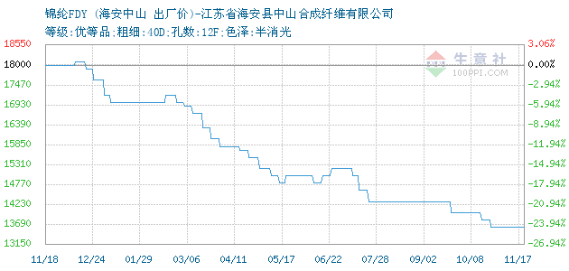 11月17日海安中山合成纤维有限公司关于锦纶FDY的报价为13600元/吨。锦纶FDY的规格:等级:优等品;粗细:40D;孔数:12F;色泽:半消光。该报价有效期为3天。报价提供方:江苏省海安县中山合成纤维有限公司。