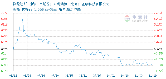 11月17日新拓关于涤纶短纤的报价为6340元/吨。涤纶短纤的规格:新拓 优等品 1.56dtex*38mm 熔体直纺 棉型 。该报价有效期为1天。报价提供方:永利熵策 (北京) 互联科技有限公司。