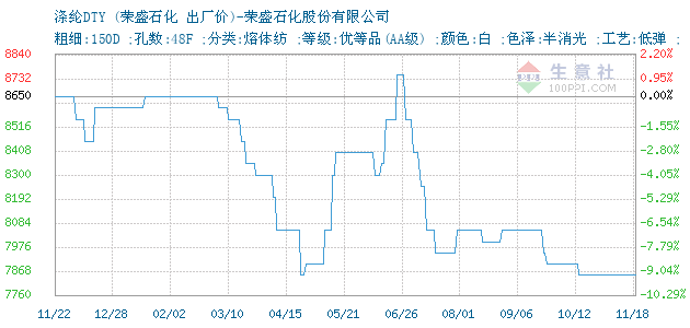 11月17日荣盛石化关于涤纶DTY的报价为7850元/吨。涤纶DTY的规格:粗细:150D ;孔数:48F ;分类:熔体纺 ;等级:优等品(AA级) ;颜色:白 ;色泽:半消光 ;工艺:低弹 ;。该报价有效期为7天。报价提供方:荣盛石化股份有限公司。