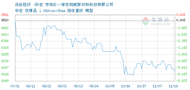 11月17日华宏关于涤纶短纤的报价为6150元/吨。涤纶短纤的规格:华宏 优等品 1.56dtex*38mm 熔体直纺 棉型 。该报价有效期为1天。报价提供方:保定纳威新材料科技有限公司。
