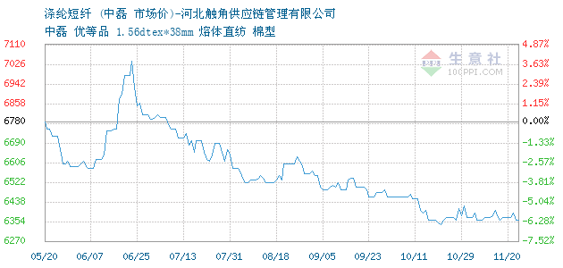11月18日中磊关于涤纶短纤的报价为6360元/吨。涤纶短纤的规格:中磊 优等品 1.56dtex*38mm 熔体直纺 棉型 。该报价有效期为1天。报价提供方:河北触角供应链管理有限公司。