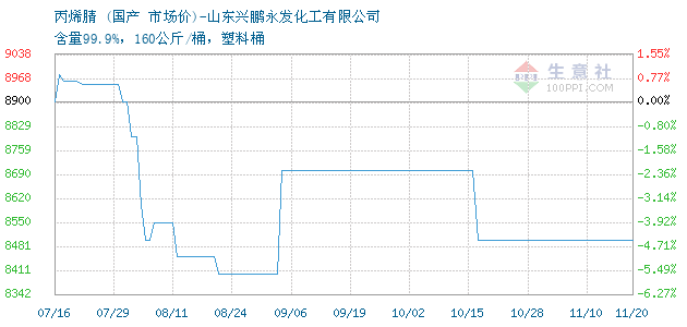 11月18日国产关于丙烯腈的报价为8500元/吨。丙烯腈的规格:含量99.9%,160公斤/桶,塑料桶。该报价有效期为3天。报价提供方:山东兴鹏永发化工有限公司。