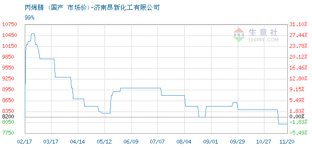 11月18日国产关于丙烯腈的报价为8000元/吨。丙烯腈的规格:99%。该报价有效期为3天。报价提供方:济南昂新化工有限公司。