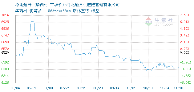 11月18日华西村关于涤纶短纤的报价为6330元/吨。涤纶短纤的规格:华西村 优等品 1.56dtex*38mm 熔体直纺 棉型 。该报价有效期为1天。报价提供方:河北触角供应链管理有限公司。