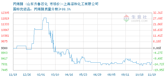 11月19日山东齐鲁石化关于丙烯腈的报价为8100元/吨。丙烯腈的规格:国标优级品;丙烯腈质量分数≥99.5%。该报价有效期为3天。报价提供方:上海溶和化工有限公司。