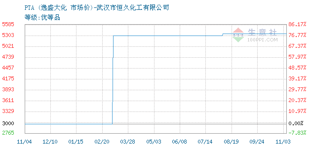 11月02日逸盛大化关于PTA的报价为5350元/吨。PTA的规格:等级:优等品。该报价有效期为1天。报价提供方:武汉市恒久化工有限公司。