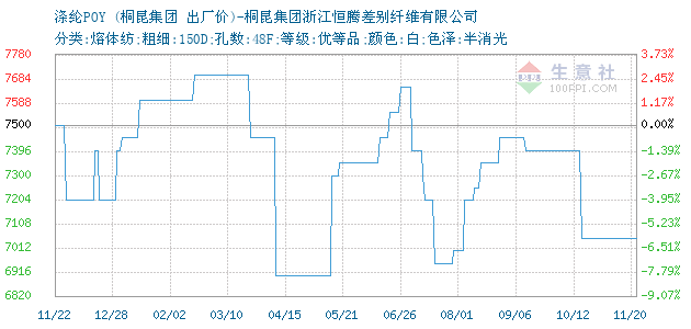 11月20日桐昆集团股份有限公司关于涤纶POY的报价为7050元/吨。涤纶POY的规格:分类:熔体纺;粗细:150D;孔数:48F;等级:优等品;颜色:白;色泽:半消光。该报价有效期为7天。报价提供方:桐昆集团浙江恒腾差别纤维有限公司。