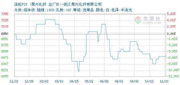 11月20日聚兴化纤关于涤纶POY的报价为6500元/吨。涤纶POY的规格:分类:熔体纺;粗细:150D;孔数:48F;等级:优等品;颜色:白;色泽:半消光。该报价有效期为7天。报价提供方:浙江聚兴化纤有限公司。