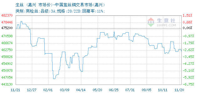 11月20日中国茧丝绸交易市场(嘉兴)关于生丝的报价为462000元/吨。生丝的规格:类别:商检丝;品级:3A;规格:20/22D;回潮率:11%;。该报价有效期为3天。报价提供方:中国茧丝绸交易市场(嘉兴)。